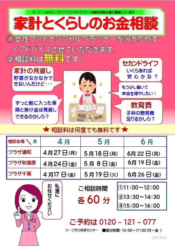 組合員さんにより添った女性FP(ファイナンシャルプランナー)による無料相談です。